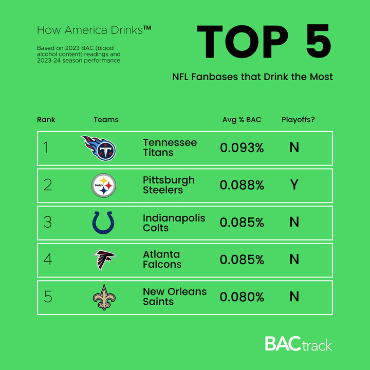 As part of our How America Drinks™ series, the BACtrack analytics team analyzed over 28,000 anonymous BAC results to determine which fanbase drank the most during the 2023-2024 NFL season.