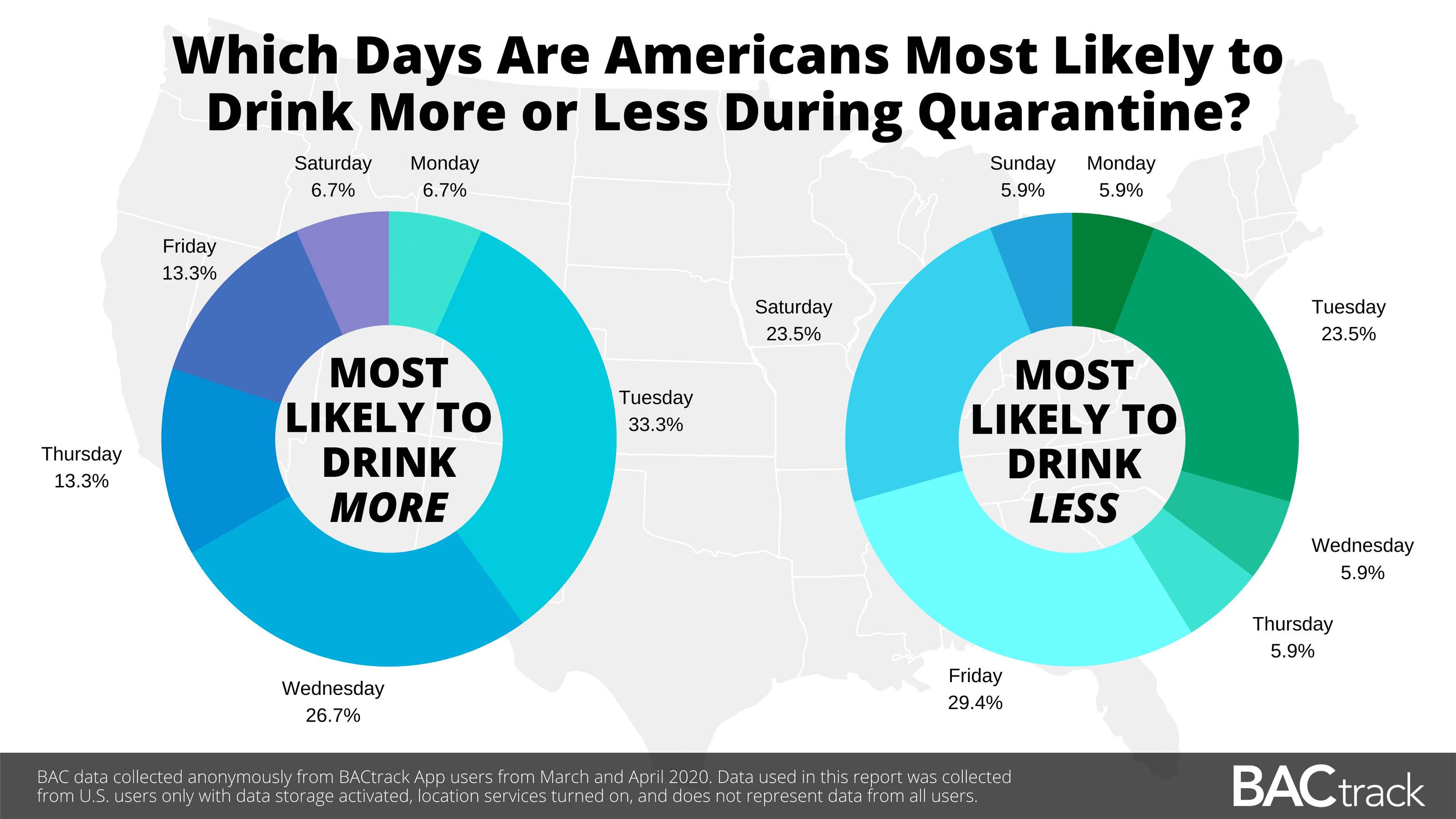 Data for this BACtrack Consumption Report was collected anonymously from users of the BACtrack App which connects with BACtrack Mobile, C6 and C8 smartphone breathalyzers via Bluetooth. Data is viewed in aggregate and represents unique BAC tests from March and April 2020. Data used in this report was collected from U.S. users only with data storage activated, location services turned on, and does not represent data from all users.
