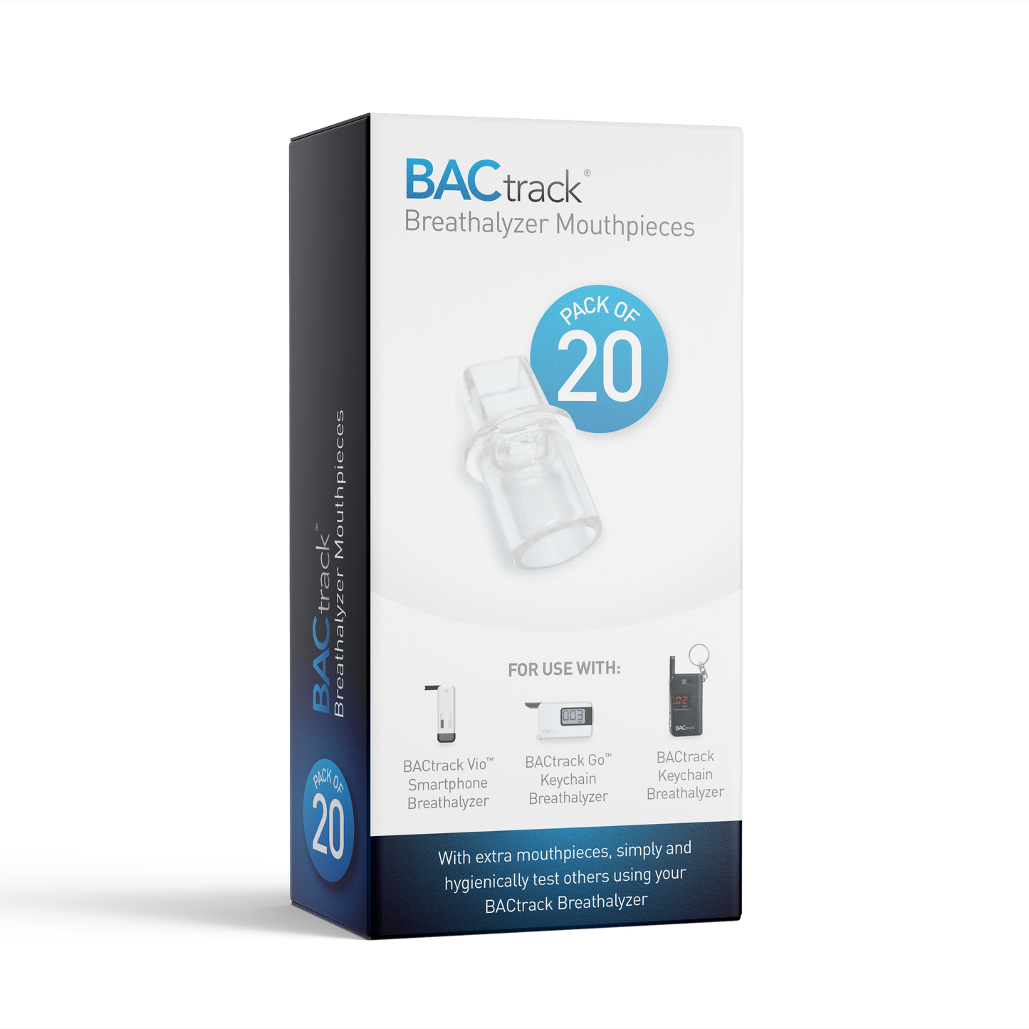 Available in packs of 10, 20 and 50, having extra BACtrack replacement breathalyzer mouthpieces (sometimes called breathalyzer tips) makes sharing your BACtrack easy and sanitary. Made of FDA compliant, food-grade plastic, they are easily removable, washable and reusable. To clean, simply drop into soapy water, rinse, and air dry. Mouthpieces do not affect the accuracy or operation of your BACtrack, but they do make it easy and safe for testing others. Compatible with the BACtrack Keychain, BACtrack Go, BACtrack Vio and BACtrack T60 breathalyzers. Not compatible with BACtrack C6 and C8 personal breathalyzers.